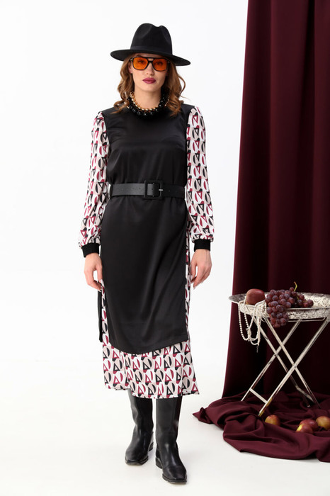 Платье комбинированное, состоящее из двух частей: верхней и нижней. Нижняя часть: платье А-силуэта свободного прямого кроя с втачным рукавом. По окату рукава сборка, по низу манжет. По спинке шов. Горловина полукруглая, застегивается на пуговицу по спинке.Верхняя часть - имитация удлиненного жилета прямого кроя. В комплект к платью идёт ремень из экокожи, может отличаться от заявленного на фото.