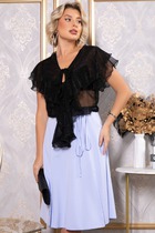 Платье полуприлегающего силуэта, отрезное по линии талии. Горловина V-образной формы, обработана притачной обтачкой. На планке застёжка на петли и пуговицы. Талия собрана на резинку. Рукав цельнокроеный широкий, низ рукава собран на резинку. Юбка платья имеет два волана разной длины, воланы собраны на сборку. В комплект к изделию идёт плетёный ремень.