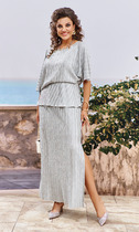 Платье женское, полуприлегающего силуэта, зауженное к низу, выполнено из костюмно- плательной ткани и гипюра, длина по среднему шву спинки 48-52 размер - 102 см; 54-62 размер - 104 см. Перед и спинка платья с настроченным гипюром, с фигурным низом, направленным от бокового шва вниз к центру. Перед с нагрудными вытачками из проймы. Спинка с талиевыми вытачками и средним швом, в котором обработана шлица. Застёжка на потайную тесьму -"молнию" расположена в левом боковом шве. Вырез горловины переда и спинки округлой формы, по переду углубленный. Рукава втачные, одношовные из гипюра. Низ рукава оформлен фестонами. Длина рукава 48-52 размер - 26 см; 54-62 размер - 33 см. Платье с плечевыми накладками.