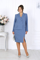 Платье женское, полуприлегающего силуэта, выполнено из костюмной поливискозы. Модель на подкладке, с плечевыми накладками и застежкой в боковом шве на потайную тесьму-«молнию». Перед ассиметричный: правая сторона оформлена в виде двубортного жакета с имитацией застежки на декоративные пуговицы. Спереди обработаны рельефные швы, направленные от пройм и прорезные карманы с клапаном; на левой части переда рельеф заканчивается разрезом. Спинка со средним и рельефными швами, направленным от пройм. Воротник пиджачного типа. Рукав длинный, втачной. Длина платья - 104 см; длина рукава - 61 см.