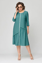 Полуприлегающий силуэт аккуратно подчеркивает фигуру, не сковывая движений, а продуманные вытачки по переду и спинке создают красивую посадку, особенно для женщин с формами. Вертикальный фигурный подрез по центру визуально вытягивает силуэт и делает образ стройнее. Контрастная планка с декоративными пуговицами добавляет изящный акцент и эффектно имитирует застежку, придавая платью стильный и ухоженный вид.