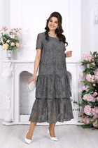 Платье женское, свободного кроя А силуэта, выполнено из хлопкового гипюра. Модель на хлопчатобумажной подкладке, с коротким рукавом, без плечевых накладок. По переду обработаны вытачки, направленные от пройм. Платье отрезное по линии бёдер с притачным, присборенным воланом. Второй волан присборен и пришит к низу подкладки. Вырез горловины спинки округлый, по переду – углубленный округлый. Длина платья –125 см; длина рукава-22 см.