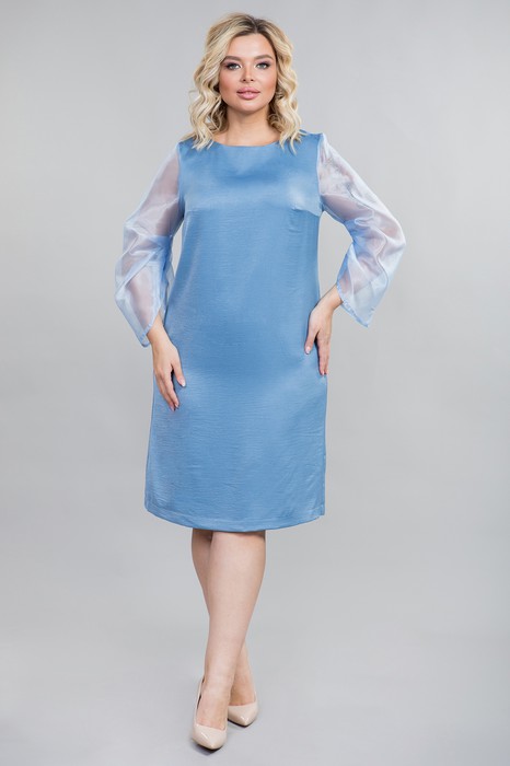 Нарядное платье прямого силуэта выполнено из легкой ткани со струящимся эффектом. Перед и спинка целые. Перед с двумя нагрудными вытачками. Горловина платья в форме лодочка обработана обтачками. Оригинальный втачной рукав с мягкими складками по среднему шву выполнен из органзы с напылением. Рукав свободный, низ рукава ассиметричный. Длина рукава от плечевой точки в 48 р-ре – 55 см. в 58 р-ре – 57 см., ширина рукава по низу в 48 р-ре – 40 см. в 58 р-ре – 46 см. Платье без подклада и застежек. Длина изделия по спинке в 48 – 98 см. в 58 р-ре – 104 см.