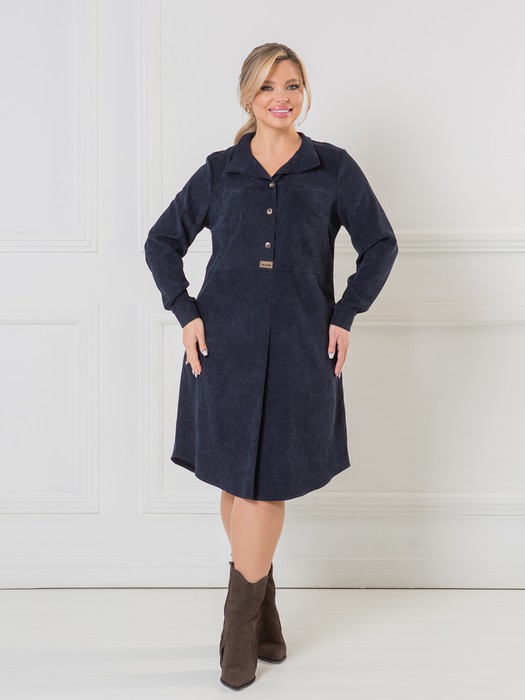 Удобное повседневное платье А-силуэта, выполнено из эластичного микровельвета. Платье по переду отрезное по линии талии. Верх переда с двумя нагрудными вытачками и центральной застежкой на петли и пуговицы. Нижняя часть платья со складкой посередине, имитирующей шлицу. Шов притачивания линии талии с отделочной строчкой и настрочной эмблемой по низу застежки. Спинка со средним швом. Горловина переда и спинки с втачным воротником по типу апаш. Рукав втачной длинный с притачными манжетами по низу. Длина рукава от плеча в 50 р-ре –В В 58 см. в 64 р-ре – 64 см., ширина рукава по низу в 50 р-ре – 20 см. в 64 р-ре – 24 см. Манжеты с застежкой на петли и пуговицы. Платье без подклада. Длина изделия по спинке в 50 р-ре – 100 см. в 64 р-ре – 109 см.