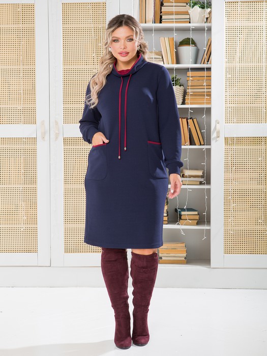 Удобное повседневное платье прямого силуэта, выполнено из трикотажного полотна. Перед платья целый, с двумя нагрудными вытачками и фигурными накладными карманами. Карманы с узкой притачной листочкой. Спинка со средним швом. Платье с высоким воротником стойкой выполненным в сочетании 2-х видов ткани и кулиской со шнурком, позволяющим регулировать объем воротника. Рукав втачной длинный, с притачным манжетом по низу. Длина рукава от плеча в 50 р-ре – 61 см. в 64 р-ре – 64 см., ширина рукава по низу в 50 р-ре – 20 см. в 64 р-ре – 26 см. Внутренний воротник платья, декоративный шнурок и листочки кармана выполнены из ткани отделочного цвета. Платье без застежек и подклада. Длина изделия по спинке в 50 р-ре – 98 см., в 64 р-ре – 106 см.