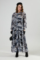 Нарядное платье из струящейся ткани, отрезное по линии талии. Верх летучая мышь, по низу рукава сборка и притачная манжета. Вырез горловины округлой формы. По переду ассиметричная деталь от плеча до линии подреза. По линии подреза резинка. Нижняя часть платья клеш. К платью прилагается интересный  пояс, украшенный стразами.