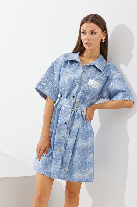 Выполнено из джинсовой ткани (хлопок) плательного ассортимента. Платье с центрально-бортовой застежкой на цельнокроеную планку на петли и пуговицы. Воротник стояче-отложной, с цельнокроеной стойкой. В боковых швах расположены карманы, которые закреплены отделочной строчкой. В области груди на деталях переда расположены накладные карманы, левый карман декорирован печатью. Спинка цельная. К платью прилагается пояс из основной ткани.