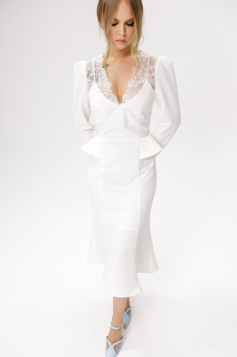 Приталенное платье с кружевным лифом и отлетными деталями по талии.