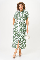 Модель полуприлегающего силуэта, с отрезной линией талии и втачным поясом. На верхней части переда настрочена планка, на нижней - клапаны. Округлый вырез горловины спереди подчёркнут планкой. Средний шов спинки снизу заканчивается разрезом. Платье декорировано пуговицами.