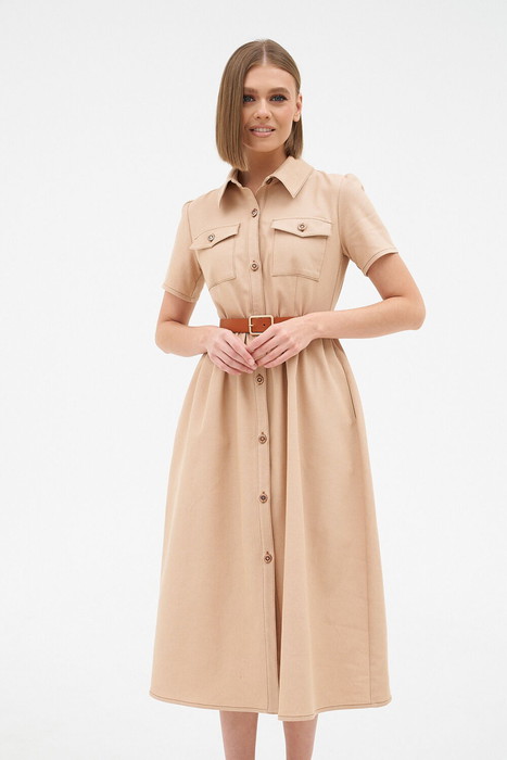 Элегантное платье из бежевого джинса средней плотности. Прямого силуэта, длина миди, застегивается на пуговицы по груди.