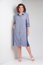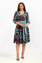 Платье отрезное по линии талии, полуприлегающего кроя, выполнено из плательной струящейся ткани. Горловина с рубашечным воротником на притачной стойке. Лиф с центральной застежкой на потайную планку на петли и пуговицы. По талии обработана резинка для регуляции размера. Юбка с имитацией запаха с застежкой на притачной пояс из основной ткани, который фиксируется на бант. Рукава длинные с притачной манжетой с застежкой на пуговицы.