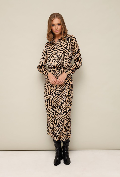 Платье отрезное по линии талии, полуприлегающего кроя, выполнено из плательной струящейся ткани. Горловина с рубашечным воротником на притачной стойке. Лиф с центральной застежкой на потайную планку на петли и пуговицы. По талии обработана резинка для регуляции размера. Юбка с имитацией запаха с застежкой на притачной пояс из основной ткани, который фиксируется на бант. Рукава длинные с притачной манжетой с застежкой на пуговицы.