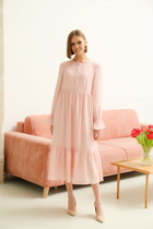 Элегантное платье прилегающего силуэта отрезное по линии талии, выполнено из костюмно-плательной ткани. V-образный вырез горловины с имитацией запаха, с углубленным воротником шалевого типа, прикрывающий руки. По краю воротника и в вертикальном подрезе юбки обработана отделочная деталь контрастного цвета. Спинка со средним швом, переходящим в шлицу.