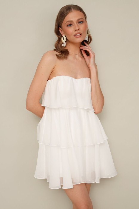Коктельное ярусное платье в длине мини, выполнено из воздушной вискозной ткани. Лиф с фигурным вырезом линии декольте и с корсетными чашками. По спинке обработана потайная застежка на резинку с крючками, для комфортного прилегания лифа по линии груди. В среднем шве спинки застежка на потайную молнию. Платье на подкладке. В комплекте прилагаются силиконовые бретельки.