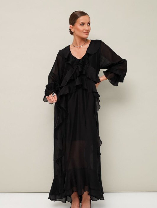 Летящее платье А-силуэта, выполнено из полупрозрачной вискозной ткани. Горловина с V-образным вырезом-каплей с завязками. Лиф переда с подрезами с воланами, переходящими на спинку. Юбка с вертикальными подрезами с воланами. Рукава-реглан с манжетами на резинке. Низ фигурной формы. Платье обработано подкладкой.