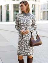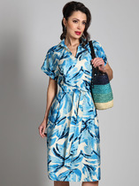 Платье свободного кроя, длиной до середины бедра. На левом переде настрочен накладной карман. Воротник пиджачного типа. Застежка по переду потайная на петли и пуговицы. Рукава одношовные, втачные, длинные. По низу рукава обработан разрез, односторонние складки и притачная манжета, которая застегивается на навесные петли и пуговицы. Платье дополняет съемный пояс с пряжкой.