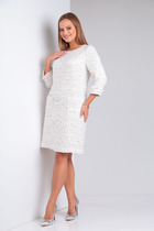 Платье полуприлегающего силуэта, выполненное на запах, длиной до середины бедра. Платье отрезное по линии талии. Лиф спинки со средним швом и рельефами. Лиф переда с рельефами от пройм до подреза по талии. Юбка спинки со средним швом и талиевыми вытачками. Юбка переда ассиметричная: правый перед укорочен, левый перед удлинен. Воротник пиджачного типа. Рукава двушовные, втачные, длинные. Застежка по переду на петли и пуговицы. Платье на подкладке с плечевыми накладками.