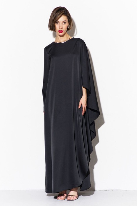 -платье ассиметричное: с левой стороны рукав цельнокроеный «летучая мышь», с правой стороны – втачной, длинный рукав