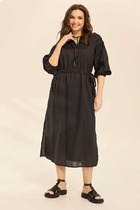 Платье женское А-силуэта, длинное, предназначено для повседневной носки. Перед цельнокроеный двумя нагрудными вытачками. Спинка цельнокроеная. Рукав короткий, одношовный. Горловина без воротника, круглая, обтачная. Платье на подкладке. Перед платья декорируется пришивным украшением из ткани, в центре которого одна страза. Длина спинки 110 см. Длина рукава 16.5 см-18 см.