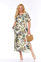 Платье женское предназначено для повседневной носки. Платье женское расширенное к низу, длинное. Перед с отрезной кокеткой, с двумя отрезными бочками, с двумя конструктивными подрезами внизу. Центральная часть переда с 8-ю декоративными складками. В швах соединения бочков с центральной частью переда обработаны карманы. Спинка со средним швом, с двумя декоративными конструктивными подрезами внизу от боковых швов. Горловина круглая, обтачная, без воротника. Рукав втачной, короткий, одно шовный. Ширина складки переда 1,5 см. Платье с плечевыми накладками. Длина спинки 133 см. Длина рукава 22 см