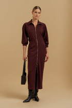 Платье женское отрезной по линии талии, расширенное к низу, длиной до нижней части икры. Верхняя часть переда с двумя отрезными кокетками, с двумя притачными планками, с легкой сборкой по шву притачивания кокеток, нижняя часть с горизонтальным подрезом, верхний срез нижней части которого с легкой сборкой. Верхняя часть спинки цельнокроенная, нижняя часть- с горизонтальны подрезом, верхний срез нижней части которого с легкой сборкой. Горловина круглая, с втачной стойкой. Застежка центральная на 5 вертикальных обметанных петель и пять пришивных пуговиц. По линии талии платье собрано на эластичную тесьму. Рукав втачной, одно шовный, длиной за локоть с притачной отложной манжетой. Платье с плечевыми накладками. Длина спинки 127 см. Длина рукава 37 см