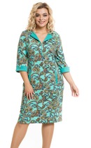 Платье женское относится к нарядной торжественной одежде. Платье женское полу прилегающего силуэта, длиной за колено. Перед с 2-мя нагрудными вытачками. Спинка с 2-мя талиевыми вытачками и средним швом, заканчивающимся шлицей. Горловина круглая, обточная, без воротника. Платье со спущенным плечом. Рукав втачной, одно шовный, длиной 7/8 из отделочной ткани; низ рукава собран на эластичную тесьму; окат рукава с 4-мя односторонними складками и 1-оё встречной по центру. Платье на подкладке. Платье без плечевых накладок. Длина спинки 107 см, длина рукава 43 см, длина рукава от горловины 60 см.