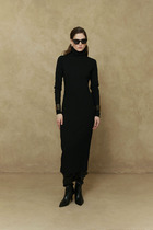 Платье женское, А-силуэта, длиной до середины колена. Перед с 2-мя отрезными кокетками с 2-мя нагрудными вытачками, с 2-мя ассиметричными частями переда с приточными по низу воланами, с 2-мя приточными вертикальными планками из отделочной ткани, с 2-мя декоративными вставками из отделочной ткани, с 2-мя защипами шириной 1,0 см с каждой стороны. Спинка с отрезной кокеткой, с 2-мя таллиевыми вытачками, по низу с приточным воланом, с лёгкой сборкой по верхнему срезу. Горловина круглая, с втачной плоско-лежащей стойкой. Застёжка центральная на 11-ть обмётанных вертикальных петель и 11-ть пришивных пуговиц. Рукав втачной, короткий, одно шовный, с приточной манжетой из отделочной ткани. Платье на подкладке. Платье без плечевых накладок. Длина спинки 99 см, длина рукава 23 см.