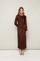 Платье женское предназанеченное для повседневной носки. Платье женское отрезное по линии талии, длиной до нижней части икры. Верхняя часть переда с 2-мя нагрудными вытачками, с 2-мя притачными планками по центру зафиксированы между собой 2-мя пришивными бусинами, нижняя часть переда с лёгкой сборкой по верхнему срезу. Верхняя часть спинки-цельнокроенная, нижняя-цельнокроенная с лёгкой сборкой по верхнему срезу. Низ платья с притачным воланом с лёгкой сборкой по верхнему срезу. Горловина фигурная, обточная, без воротника. Рукав втачной, одношовный, длиной до локтя с приточным воланом по низу с лёгкой сборкой по верхнему срезу. Верхняя часть переда на подкладке. Платье с плечевыми накладками. Длина спинки 126 см, длина рукава 33 см.