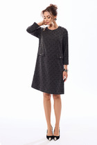 Платье женское, относится к нарядной торжественной одежде. Платье женское  полу прилегающего силуэта, длиной за колено, выполнено в виде имитации костюма. Лиф платья отлетной. Перед с 2-мя отрезными бочками, левый бочок с отделочным фигурным поясом, декорированным объёмным украшением, шов притачивания левого бочка с разрезом с закруглёнными концами. Спинка лифа со средним швом и 2-мя отрезными бочками. Лиф платья на подкладке, к которой крепится нижняя часть платья (юбка). Переднее полотнище нижней части с 2-мя таллиевыми вытачками. Заднее полотнище с 2-мя таллиевыми вытачками и средним швом, заканчивающимся шлицей. Нижняя часть платья на подкладке. Горловина круглая, обтачная, без воротника. Застёжка на потайную тесьму-молнию в среднем шве спинки. Рукав втачной, одно шовный, длиной 3/4. Низ рукава со встречной складкой, обточной, складка декорирована пришивной пуговицей. Платье с плечевыми накладками. Длина спинки 104 см, длина рукава 42 см.