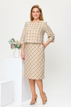 Платье женское относится к нарядной торжественной одежде, но может использовано и при повседневной носке. Платье женское, отрезное по линии талии, расширенное к низу, длиной за колено. Верхняя часть переда с отрезными рельефами, выходящими из плечевых швов, центральная часть с зафиксированным запахом. Верхняя часть спинки со средним швом и 2-мя рельефами, выходящими из плечевых швов. Горловина с V-образным вырезом, фигурная, обточная без воротника. Нижняя часть переда и нижняя часть спинки цельнокроеные, выполнены из отделочной ткани. Шов соединения верхней и нижней частей платья декорирован притачной фигурной отлетной баской. Платье с декоративным поясом из отделочной ткани, закреплённом на левом боковом шве и фиксирующимся в бант через металлическую пробивную блочку на центральной части переда. Рукав одно шовный втачной, длиной до локтя, с притачной фигурной манжетой. Платье с плечевыми накладками. Нижняя часть на подкладке. Длина платья 112 см, длина рукава 33 см.