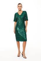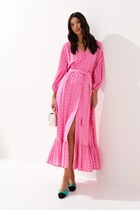 Платье из легкой плательной ткани. Платье отрезное по линии талии. По горловине переда и спинки - притачная планка. Легкая сборка от горловины по переду и по линии талии добавляет объема и воздушности. Юбка-клеш. Рукава - реглан, со сборкой по низу и широкими манжетами, застегивающимися на пуговицы и навесные петли. Застежка-молния-в боковом шве платья. Пояс в комплектацию не входит.