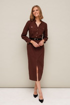 Двубортное платье из костюмной ткани на подкладке. Силуэт платья-слегка приталенный.По переду - нагрудные вытачки, по спинке -рельефы. Бочки, смещенные к переду, делают удобным расположение карманов в швах. Воротник - отложными лацканами пиджачного типа. Рукава - двухшовные, длинные, со шлицей и 2 пуговицами. Жакет застегивается на 2 основные пуговицы, 1 потайную, остальные пуговицы несут декоративный характер.