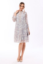 Двубортное платье из костюмной ткани на подкладке. По переду платья - нагрудные вытачки, по спинке - рельефы. Бочки, смещенные к переду, делают удобным расположение карманов в швах. Воротник - отложными лацканами пиджачного типа. Рукава - двухшовные, длинные, со шлицей и 2 пуговицами. Жакет застегивается на 2 основные пуговицы, 1 потайную. Платье украшает цветок ручной работы.