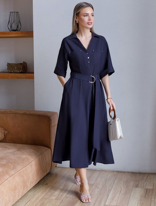 Состав: 92%Лиоцелл (Вис) 8%ПЭ Плотность: 180 Г/м2Платье-рубашка темно-синего цвета выполнено из плотного лиоцелла. Лиоцелл это более дорогой и экологичный вариант вискозы, очень прочный и шелковистый. Ткань отличается от регулярной коллекции из лиоцелла - она содержит еще больше лиоцелла (92%), благодаря чему имеет более нежную шелковистую фактуру. Свободное платье трапеция будет идеальным выбором для весны и лета. Отложной воротник добавляет классический акцент, широкий пояс с металлической пряжкой подчеркивает талию, делая силуэт выразительным и женственным. Платье с широким рукавом средней длины смотрится современно, карманы и пуговицы добавляют практичности. Платье А-силуэта идеально сядет и на большие размеры, скроет возможные недостатки и подчеркнет достоинства фигуры за счет элегантного облегания талии и расклешенной юбки. На высокий рост платье будет длины миди, а на низкий рост - длина макси. Такое красивое и комфортное платье подойдет для повседневных образов, для стилизации в стиле сафари или casual, а так же для торжественных мероприятий.