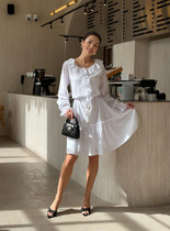 Платье женское из гладкокрашеного тканого полотна, свободное, слегка расширенное к низу, с глубоким V-образным вырезом горловины, обработанным внутренней обтачкой, без рукавов, с вытачками в области груди. Перед состоит из двух частей, в шве соединения деталей по центру длинный разрез.