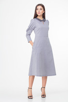 Платье женское прямого силуэта. Выполнено из плательной ткани. Платье с длинными объёмными рукавами, по низу которых, вставлена эластичная тесьма. От линии плеча до центральной части переда, расположена отрезная кокетка, в которую вставлен декоративный волан на сборке. В нижней части платья пришит фирменный логотип.  Спинка платья цельнокроеная. В области горловины – капелька, застёгивающаяся на навесную петлю и декоративную пуговицу.