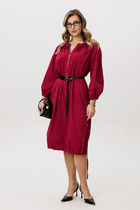 Платье выполнено из плательного струящегося сатина. Лиф отрезной по линии талии. Линия талии регулируется резинкой. Нижняя часть платья А-силуэта. Рукав длинный втачной. По низу рукава сборка и притачная манжета, застёгивающаяся на 2 петли и пуговицы. Горловина округлой формы, по центру переда капелька с завязкой. В комплекте ремень.
