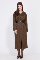 Платье женское полуприлегающего силуэта, длиной maksi. Выполнено из вискозной ткани. Перед и спинка платья цельнокроеные. По линии талии, платье собрано на 10 рядов, отстроченных эластичной тесьмой. Перед с V-образной горловиной. Рукав втачной, короткий, с притачной манжетой, переходящей в завязку. В нижней части боковых швов обработаны разрезы.