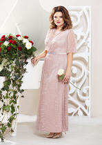 Платье из струящейся поливискозной ткани Х-образного силуэта, отрезное по линии талии. По переду и спинке лифа расположены талиевые вытачки. Юбка расклешённая, на трикотажной подкладке. В среднем шве спинки предусмотрена молния. Рукав втачной, одношовный длиной 4/5. Низ рукава собран эластичной тесьмой. длина рукава 51см (±1см).