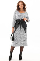 Платье из текстиля  прилегающего силуэта. Платье отрезное по линии талии. По переду и спинке лифа расположены рельефы. Юбка расклешенная из шести клиньев со встречными складками по линии талии. В среднем шве спинки предусмотрена молния. Рукав втачной покроя тюльпан, длина рукава 15 см. В комплекте ремень с декоративной пряжкой.