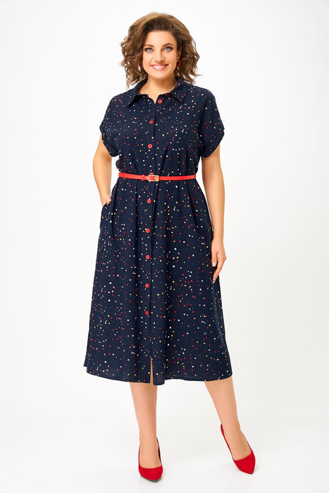 Платье-рубашка из лёгкой вискозной ткани, свободного кроя А-силуэта. Застёжка центральная на петли и декоративные пуговицы. Полочка с нагрудными вытачками, спинка цельная. Воротник рубашечного типа, отложной со стойкой. Пройма спущенная с отложной манжетой. В боковых швах обработаны карманы.