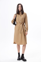 Платье А-силуэта, из струящейся шифоновой ткани на подкладке из шифона.  По переду платья нагрудные выточки, выходящие из проймы, спинка цельная. Вырез горловины овальный. Рукав длиной 7/8, в нижней части кулиса с завязкой, которая регулирует ширину рукава и создаёт по низу рюшу.