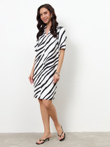 Платье прямого силуэта со спущенной линией плеча, скомбинировано из двух видов трикотажных полотен. Перед с косыми подрезами и смещённой от линии центра притачной планкой с декоративными пуговицами. В области бедра расположен накладной карман с функционирующей декоративной молнией. Спинка со средним швом. Пройма спущена, рукав длиной 7/8, горловина круглая.