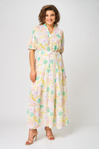 Платье из шифоновой ткани на трикотажной подкладке ,  Х-образного силуэта с полуприлегающим лифом. Платье отрезное по линии талии. По переду  лифа расположены рельефы, по спинке лифа талиевые выточки. Юбка расклешенная из шести клиньев со встречными складками по линии талии. В среднем шве спинки предусмотрена потайная тесьма-молния. Рукав втачной, покроя «тюльпан».