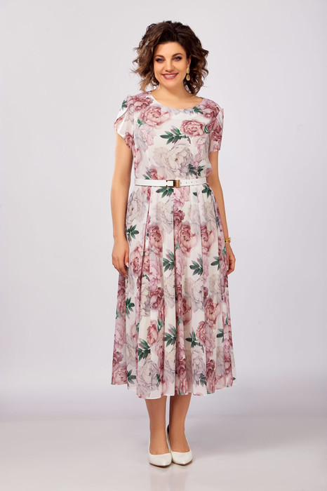 Платье из шифона на трикотажной подкладке, Х-образного силуэта с полуприлегающим лифом. Платье отрезное по линии талии. По переду лифа расположены рельефы, по спинке лифа талиевые выточки. Юбка расклешенная из шести клиньев со встречными складками по линии талии. В среднем шве спинки предусмотрена потайная тесьма- молния. Рукав втачной покроя тюльпан, длина рукава 15 см.