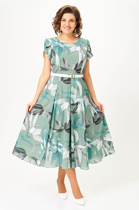 Платье из шифона на трикотажной подкладке, Х-образного силуэта с полуприлегающим лифом. Платье отрезное по линии талии. По переду лифа расположены рельефы, по спинке лифа талиевые выточки. Юбка расклешенная из шести клиньев со встречными складками по линии талии. В среднем шве спинки предусмотрена потайная тесьма- молния. Рукав втачной покроя тюльпан, длина рукава 15 см.
