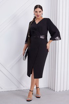Лиф полочки с нагрудными выточками и округлым вырезом горловины, лиф спинки с центральным швом и V-образным вырезом горловины. Юбка состоит из передней и задней деталей с цельнокроенными планками по бокам, которые скреплены декоративными пуговицами. Рукав втачной, короткий длиной – 28 см.