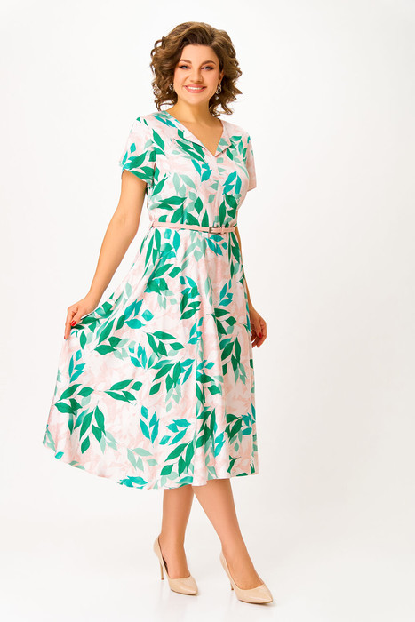 Платье из струящейся вискозной ткани, отрезное по линии талии. Лиф полуприлегающего силуэта. По полочке лифа центральный шов, нагрудные и талиевые вытачки, по спинке средний шов и талиевые вытачки. Горловина V-образной формы с отложным воротничком. Юбка расклешённая. Рукав втачной короткий, формы «тюльпан». В среднем шве спинки застёжка на потайную тесьму-молнию.