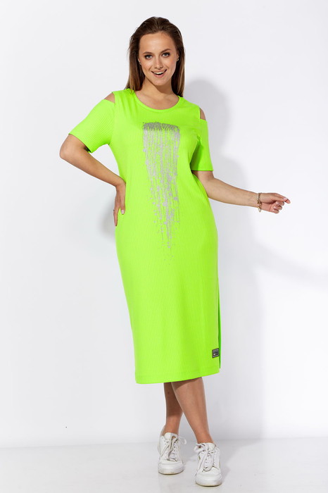 Платье женское, полуприлегающего силуэта, выполнено из трикотажного полотна (типа лапша) Рукав короткий, втачной, с открытым плечом. Вырез горловины круглой формы с подрезной бейкой. Перед задекорирован принтом. По боку, снизу разрез и нашивка. Спинка без особенностей.