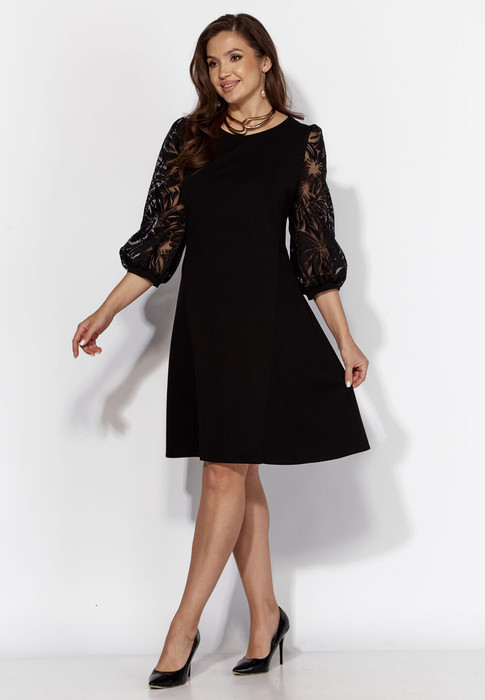 Платье женское полуприлегающего силуэта, расклешенное к низу. По переду наклонные вытачки и рельефы. По спинке талевые вытачки, подрез чуть ниже линии талии и кокетка овальной формы с разрезом и отделочной нашивкой по горловине. Горловина круглой формы. Рукав втачной, длинной 3/4 со сборкой сверху. Низ рукава присобран на манжету. Рукава и кокетка спинки выполнены из отделочной ткани(прозрачная органза с рисунком)